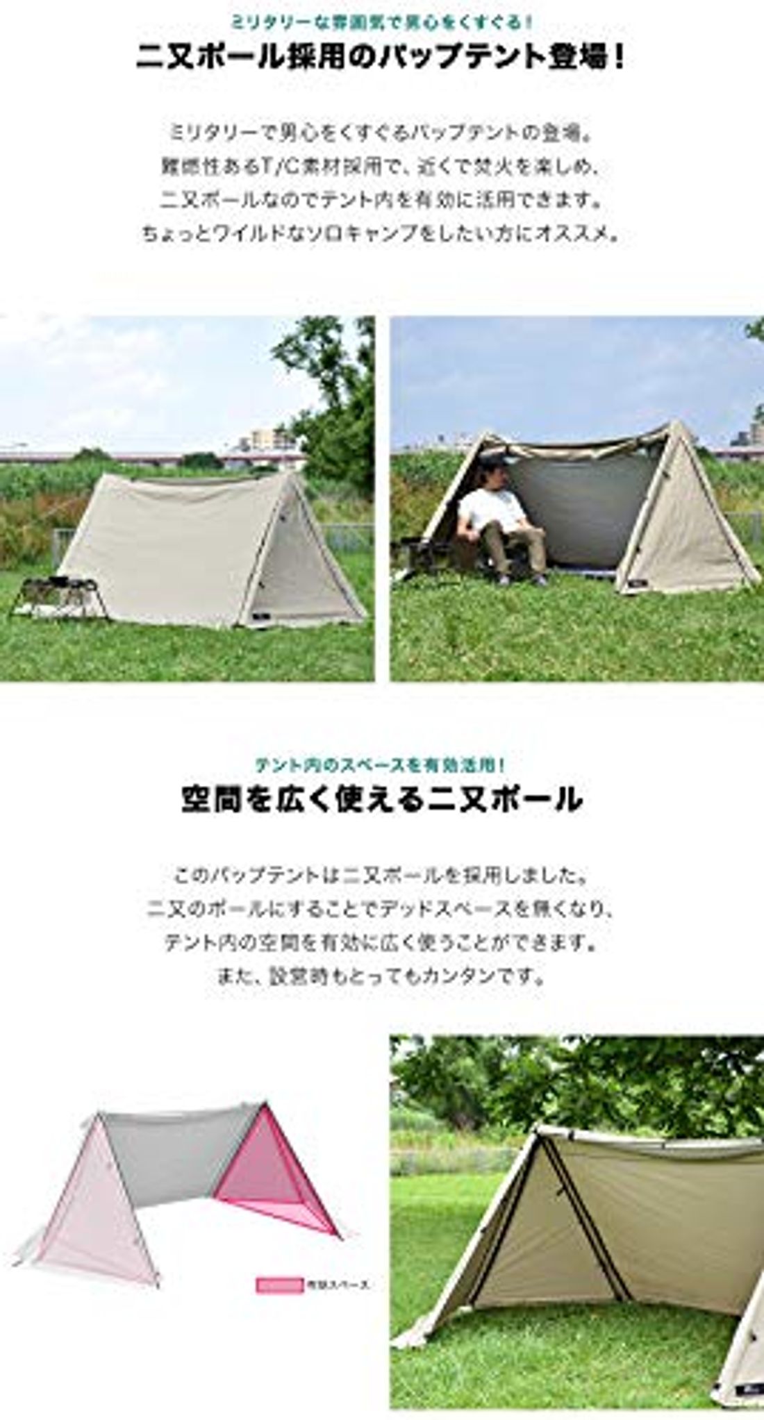 19 Anlik パップテント ソロキャンプ メッシュインナー 軽量 ポール2本 収納付き;19年04月09日 ファスナー改造したパップテント は気に入っているのですが、左右のポールの間隔が165cmしか無いためコットを置くときもポールを避けなくてはならず、狭いのが欠点でした。 多くの人が逆V字ポール(二股ポール)を自作して使われているのは知っていたのですが、そこまでして使わなくてもいいかなと思っていました。 しかし、 先日二股ポール採用のパップテント登場! ミリタリーで男心をくすぐるパップテントの登場。 難燃性あるt/c素材採用で、近くで焚火を楽しめ、 二股ポールなのでテント内を有効に活用できます。 ちょっとワイルドなソロキャンプをしたい方にオススメ。